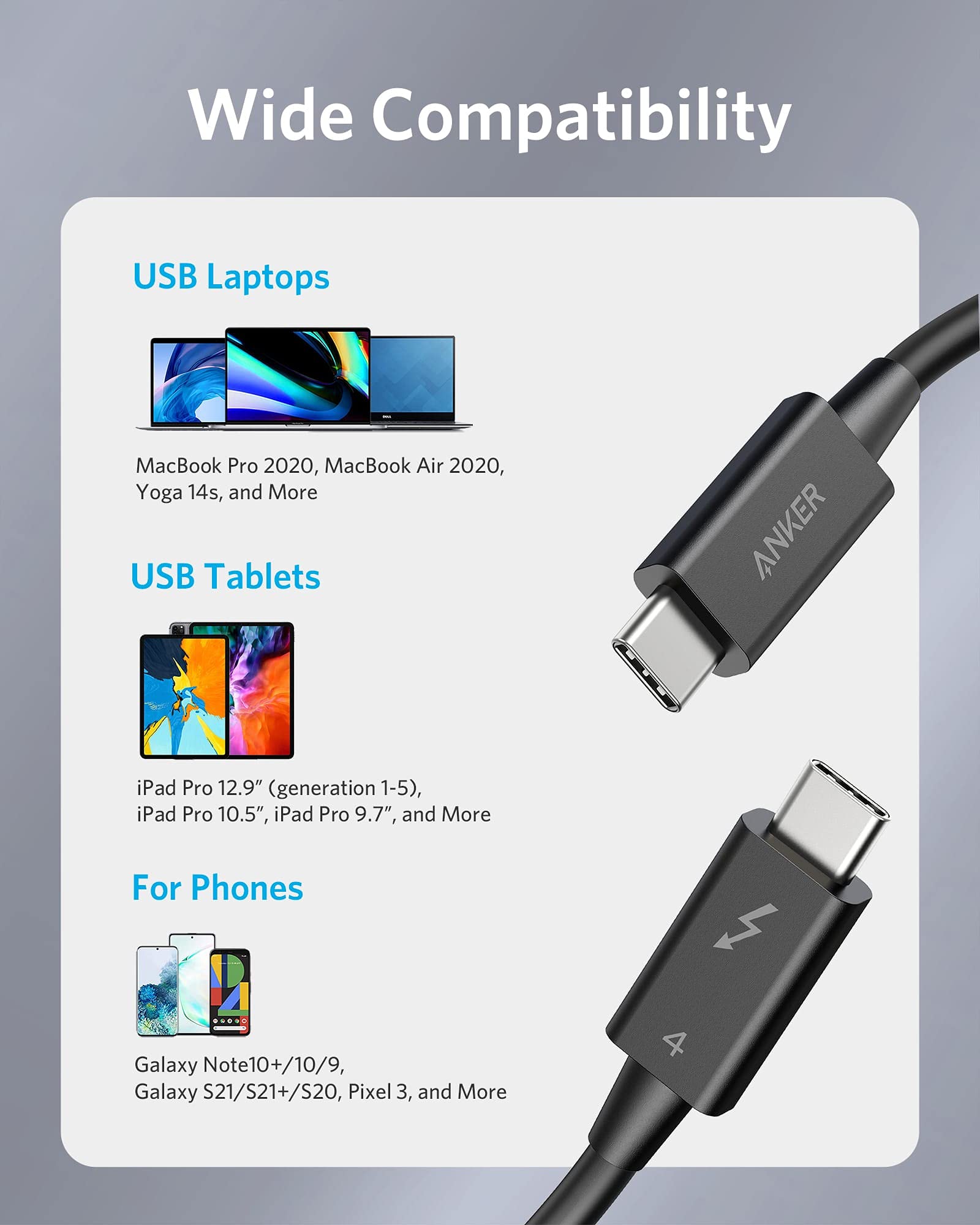 - What You Get: Anker USB-C to USB-C Thunderbolt 4 100W Cable (0.7m), welcome guide, our worry-free 18-month warranty, and our friendly customer service.
