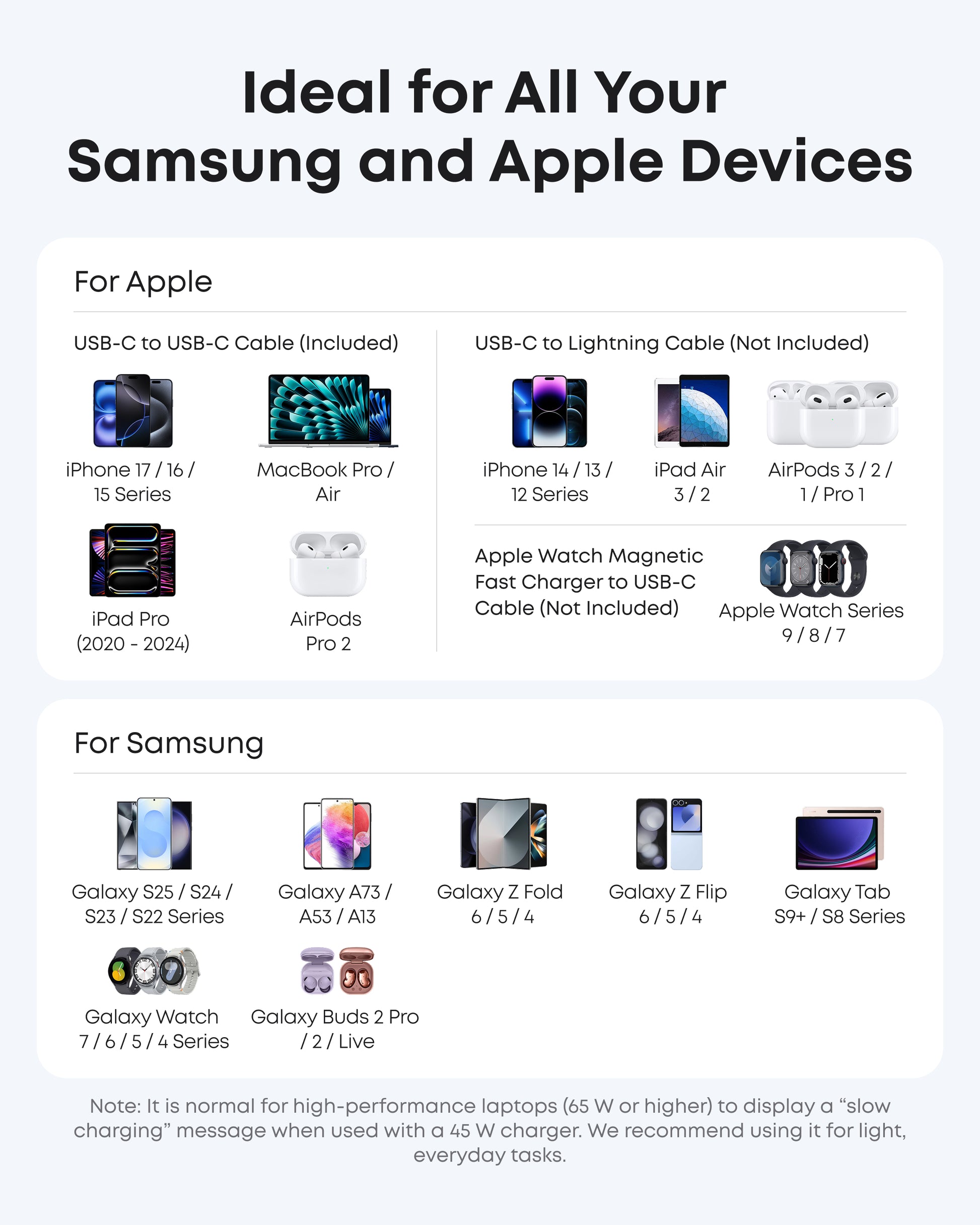 - Universal charging: Charge all your devices - whether Samsung or Apple - with a reliable charger for every need.